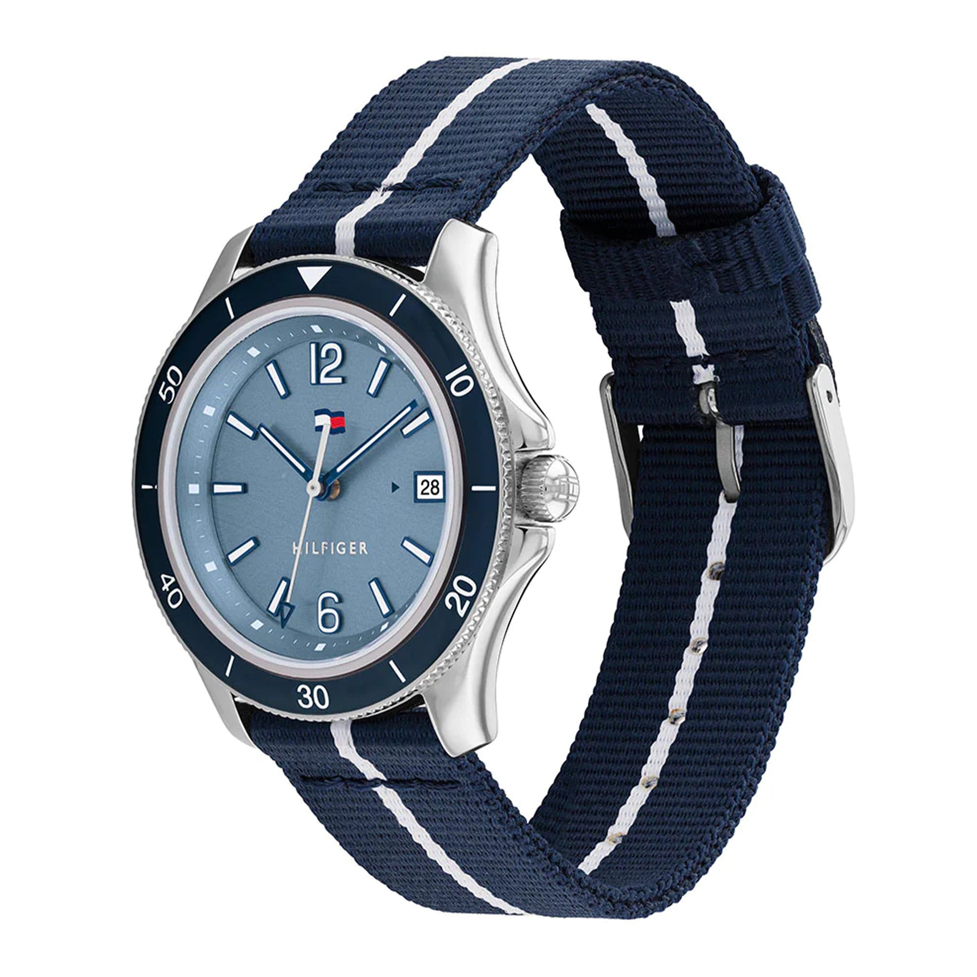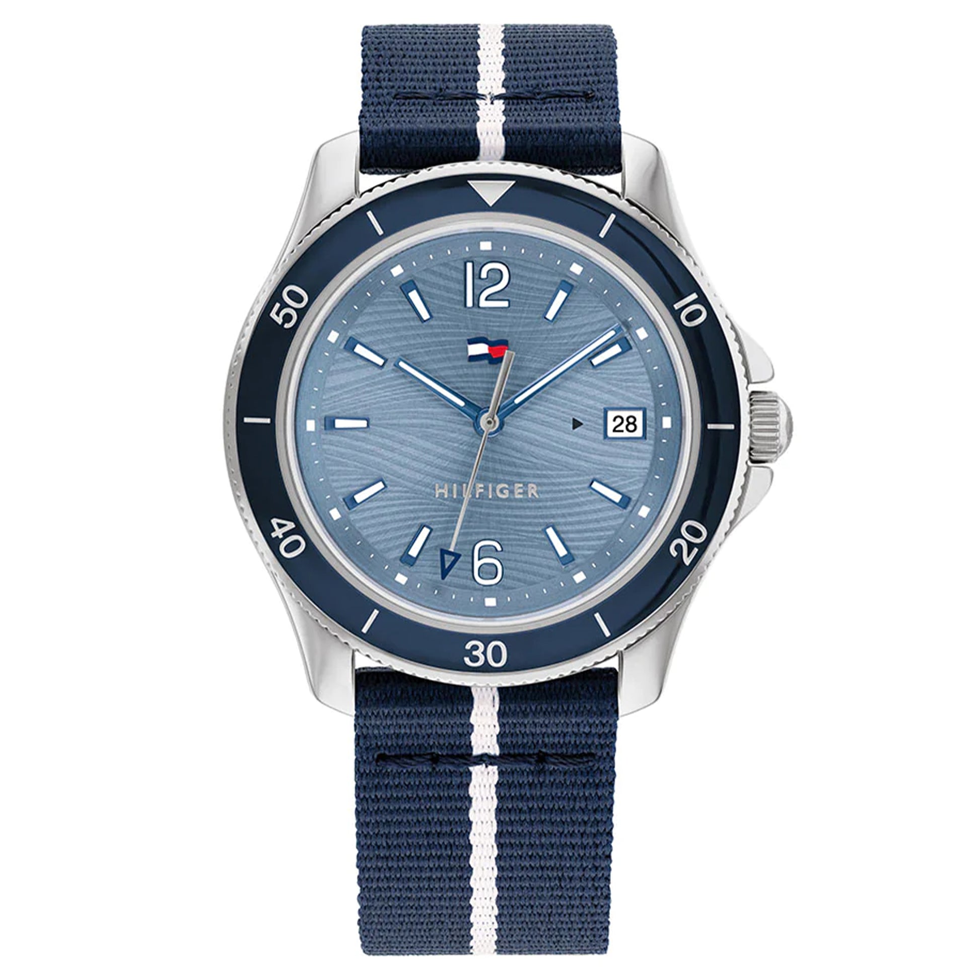 Tommy women’s watch in the DIVER tradition. The elegant wave textured dial brings a fun nautical element perfect for the Summer. New wave TH Flag with date window on link Bracelets, Silicone & Sustainable Straps. 3H, 36MM