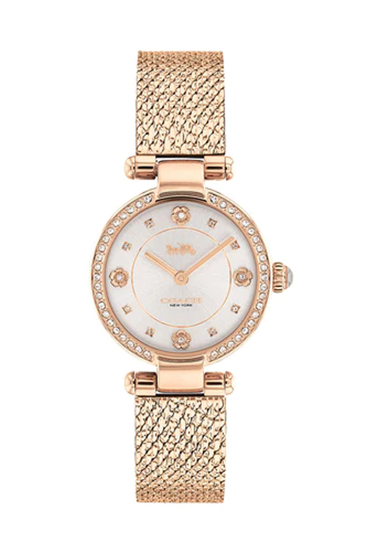 Timeless and elegant, the Cary watch is a sophisticated style perfect for day or night. The sleek rose gold tone bracelet design shimmers with crystals and features a white sunray dial detailed with the iconic Coach Horse and Carriage motif and Tea Rose markers for a heritage touch. Rose gold tone case and mesh bracelet