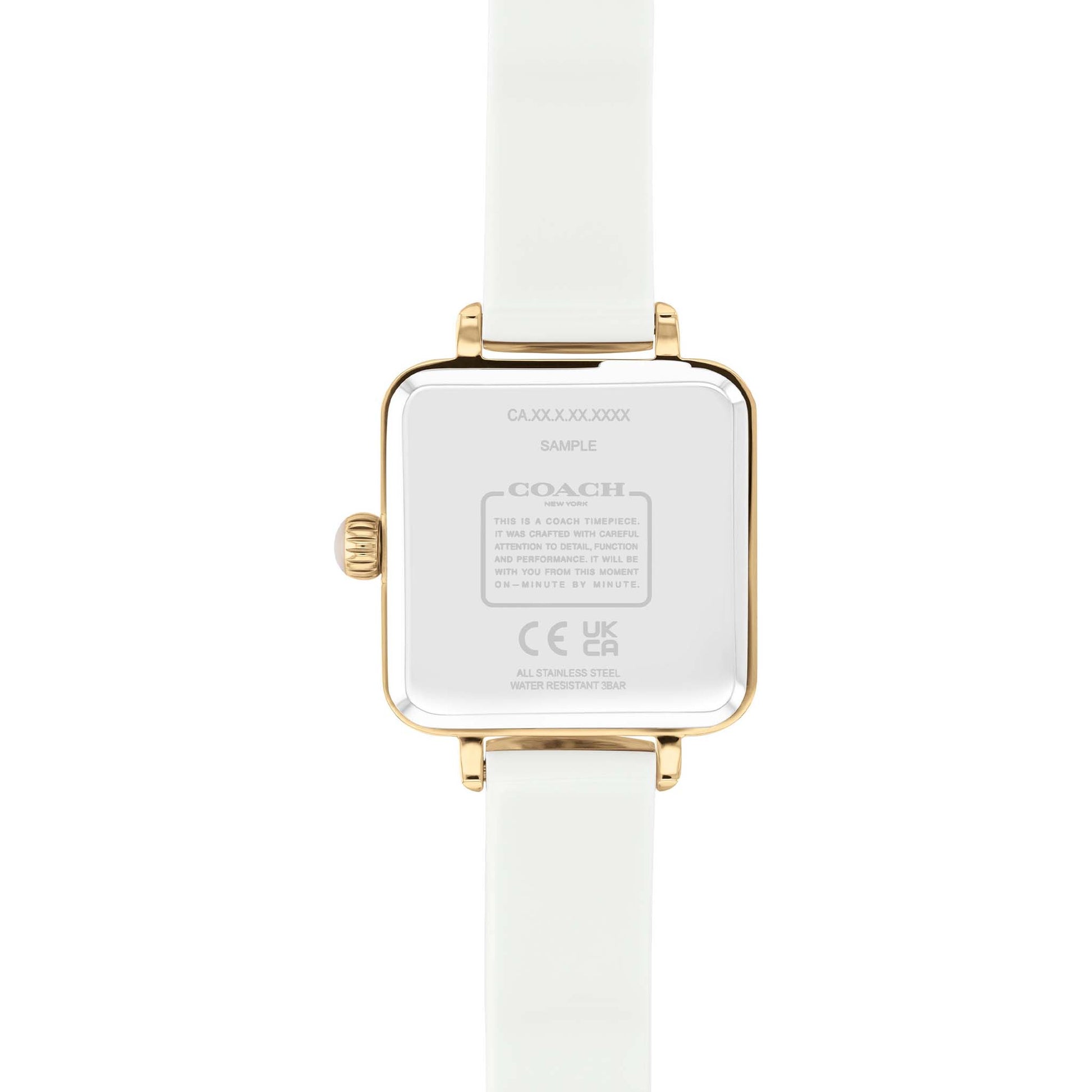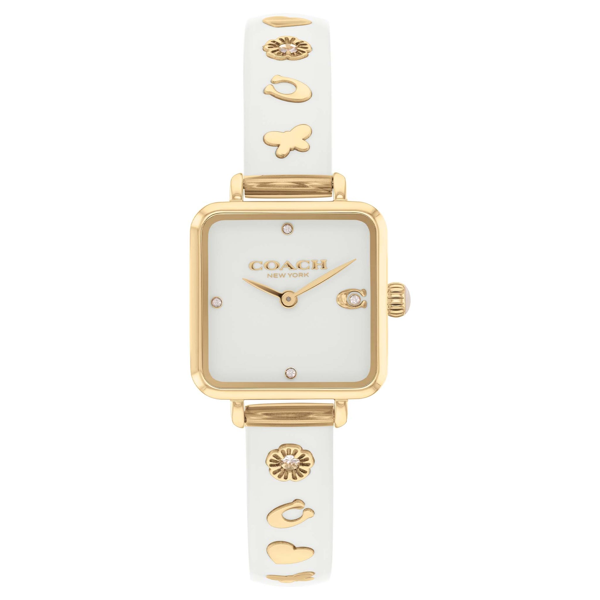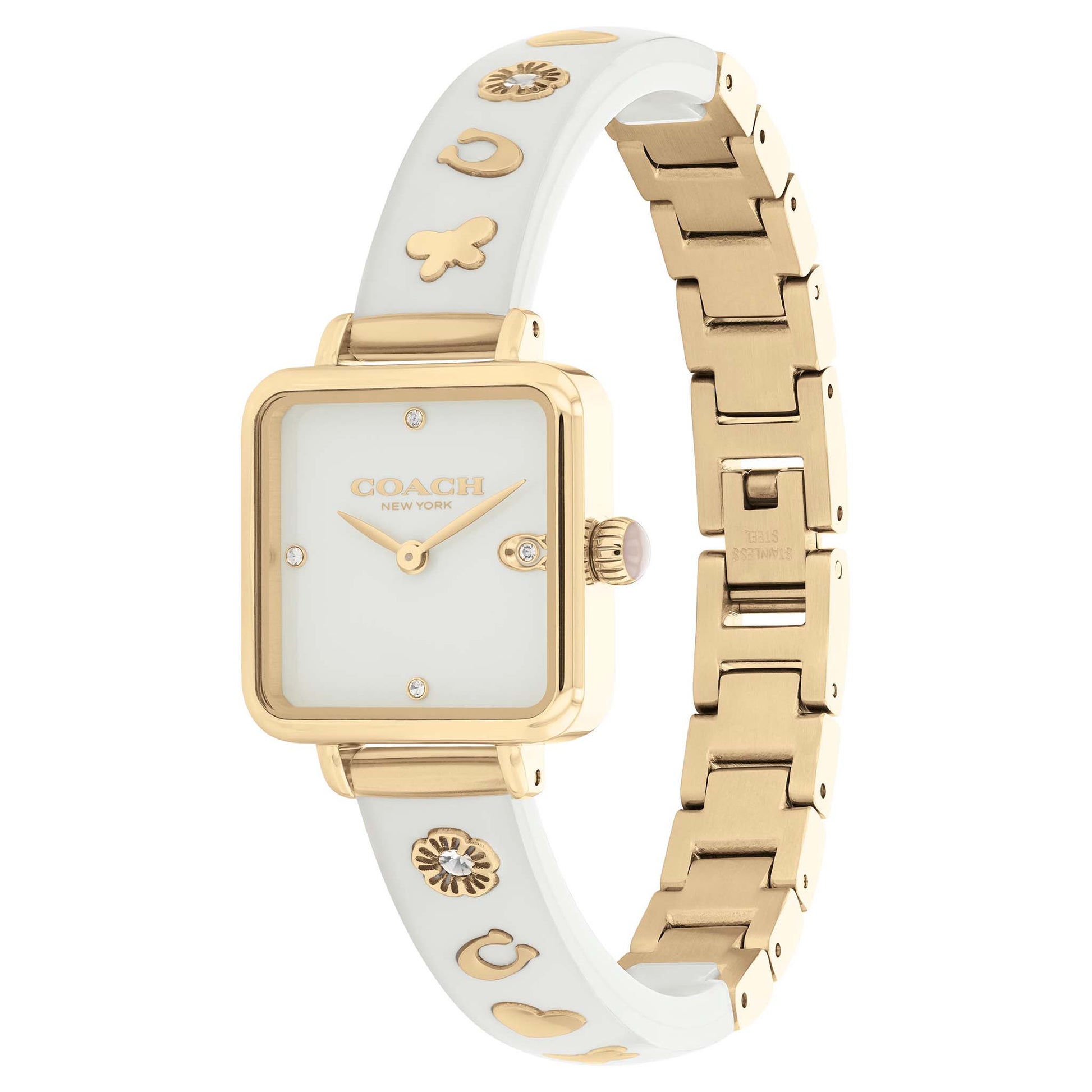 A bold square shape gives the Cass watch modern, distinctive style. Finished with a chalk resin bangle embellished with Coach motif accents, this gold tone design features a chalk lacquered dial detailed with shimmering crystal markers and the iconic Coach Signature at 3 o’clock.