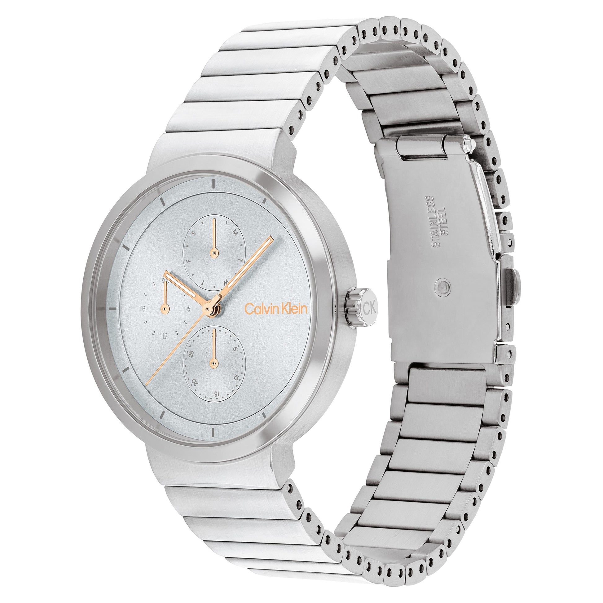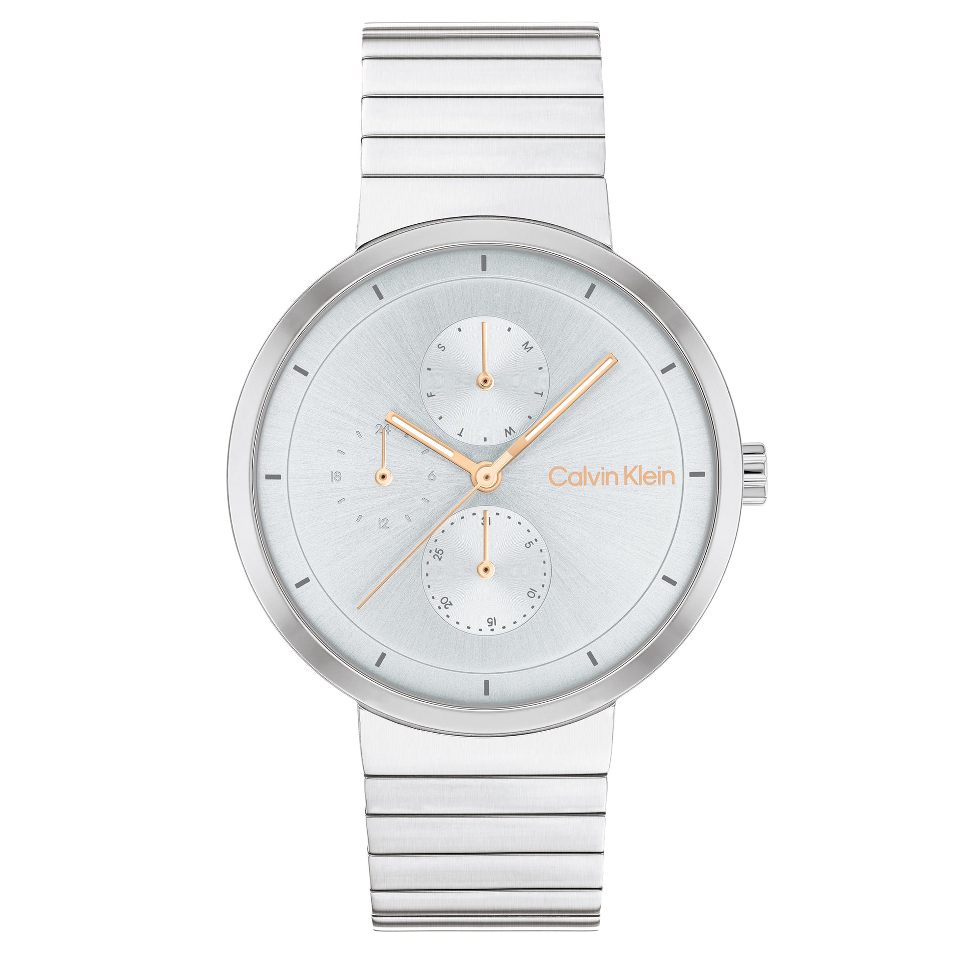 Distinctively CK. Energetic multi-function on a uni-link bracelet with a modern, minimalistic sunray dial for versatile, everyday style.
