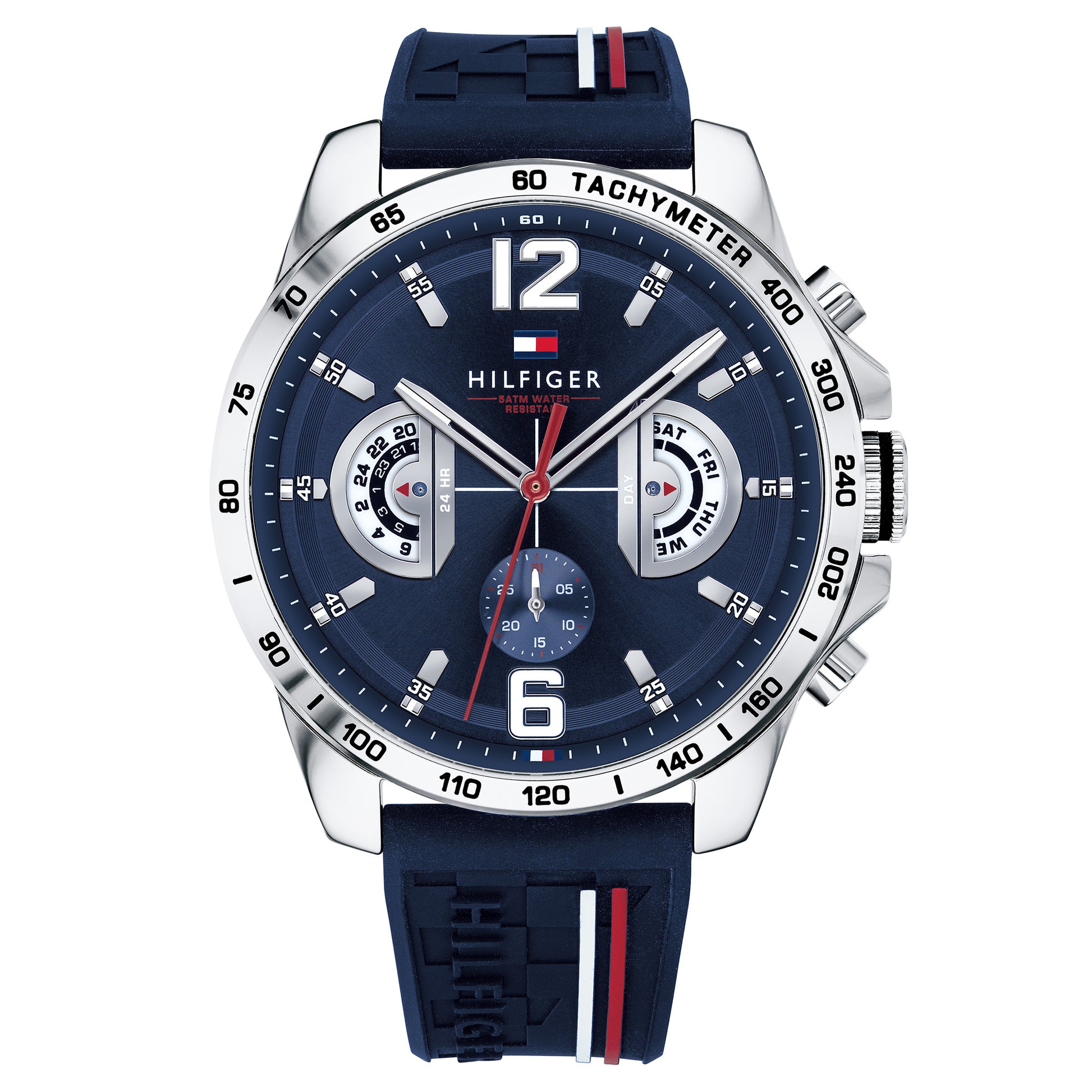 Distinctive pole-position style characterizes this men’s sport watch collection. The 46mm solid stainless steel or rose gold-toned case features a crown-protector and bold bezel. The silicone straps give a supercharged spin with racing stripes and a textural checkerboard pattern. The men’s SS18 campaign watch of the season is the racing star of the collection, featuring the iconic red, white and blue Hilfiger color palette. Water resistant to 5 ATM /50 meters.