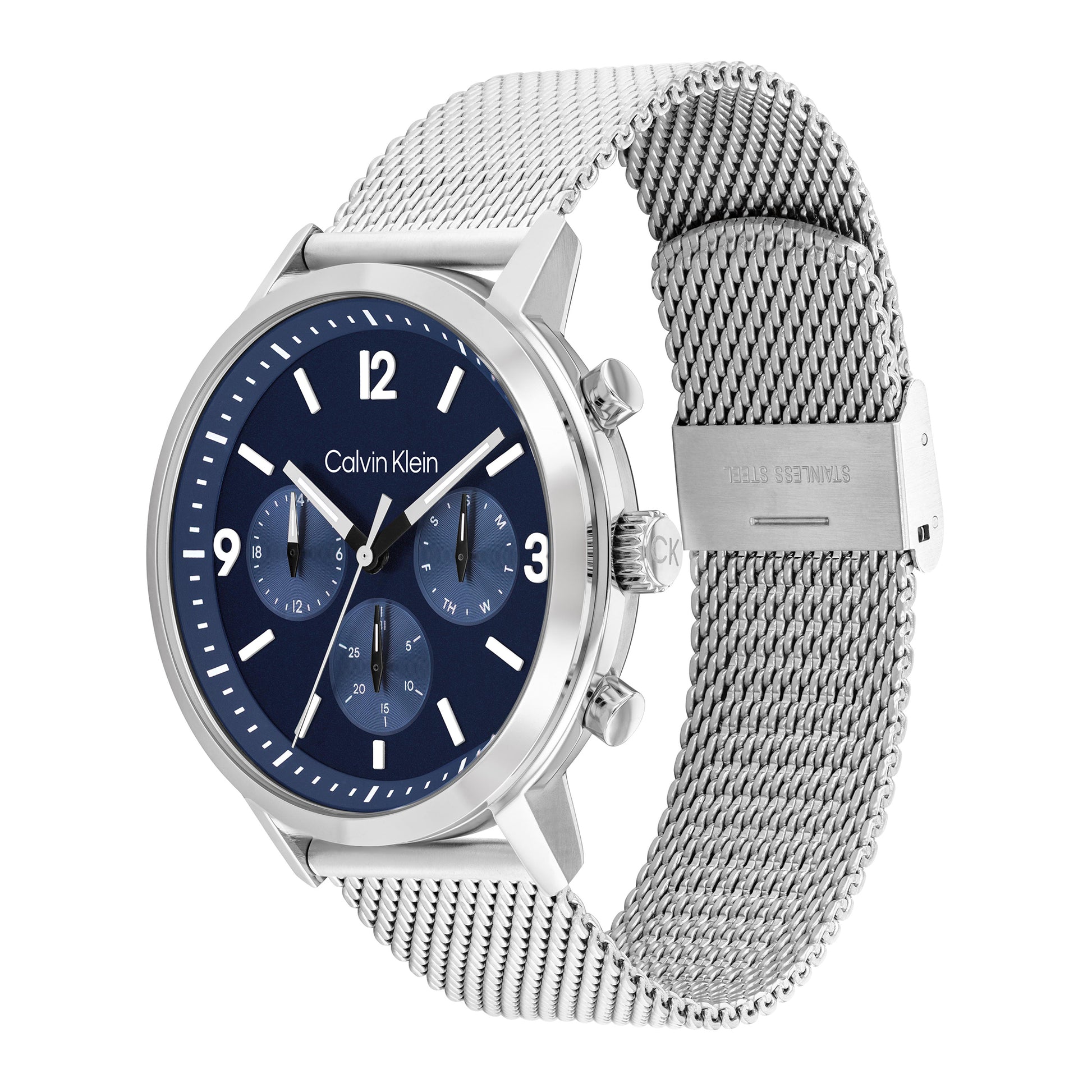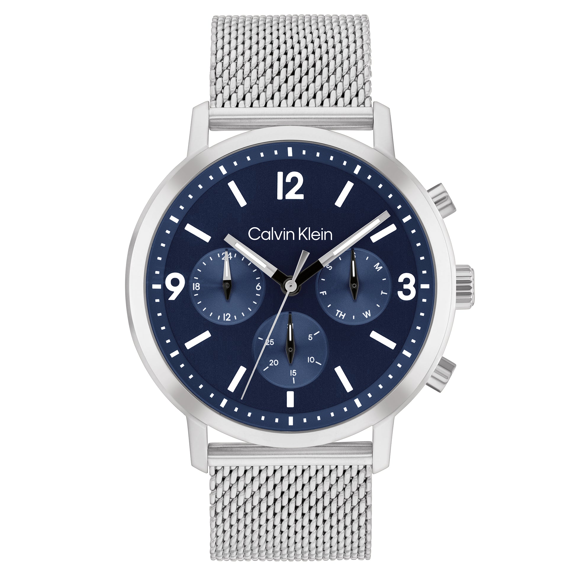 Energetic dial with bold bar and numeral indices and vertically brushed sub-eyes for a sophisticated bold look. Available on a mesh bracelet.