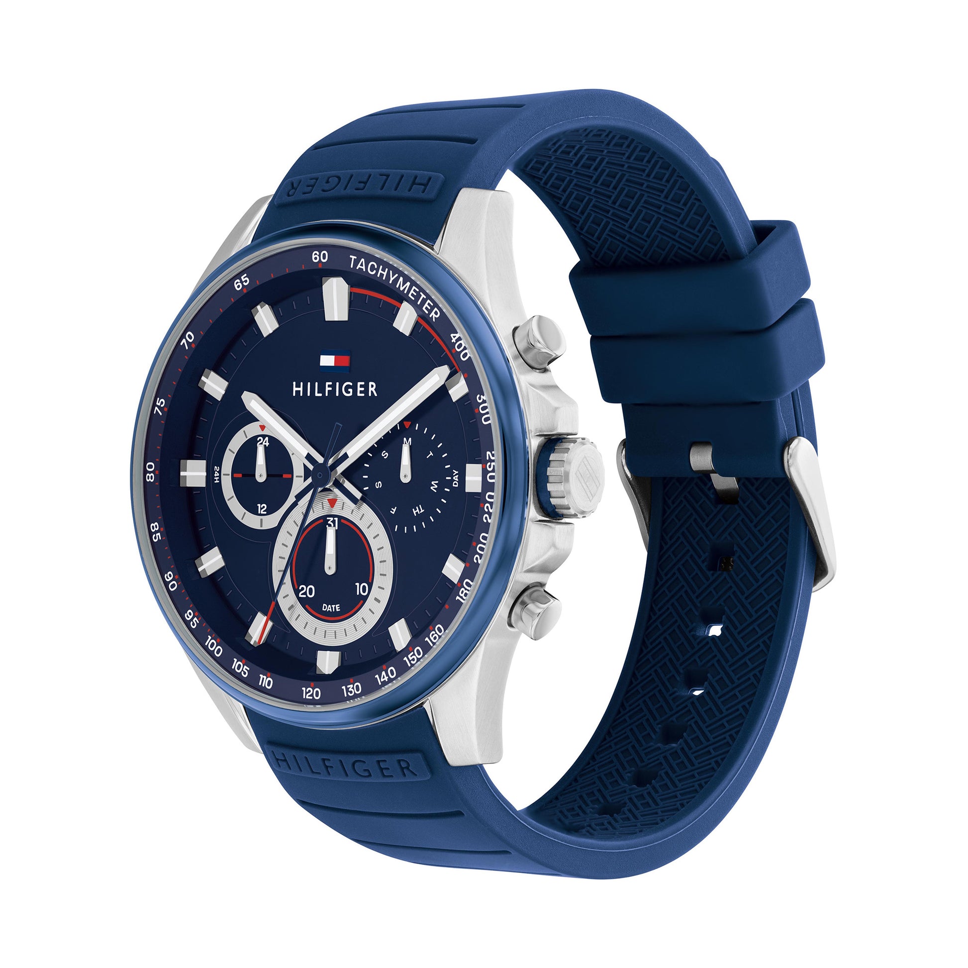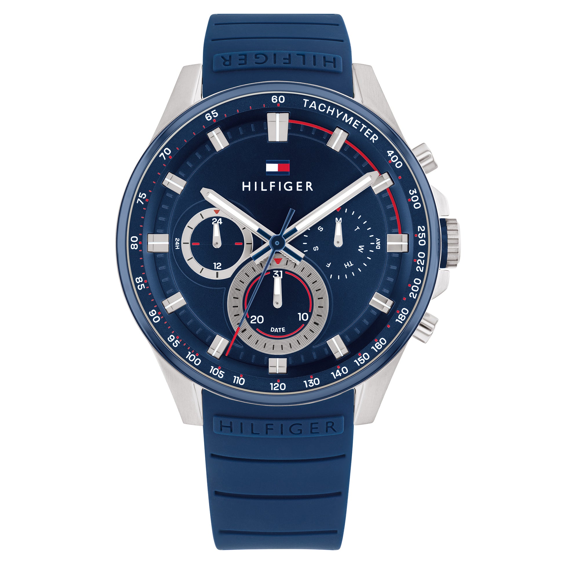 Distinctive Sport. Make every moment count with this brushed sunray dial time piece with bold accents and pops of Tommy color. Integrated link bracelets and silicone straps. 44MM Multifunction: 24-Hour (9H), date (6H), and weekday sub-eyes (3H)