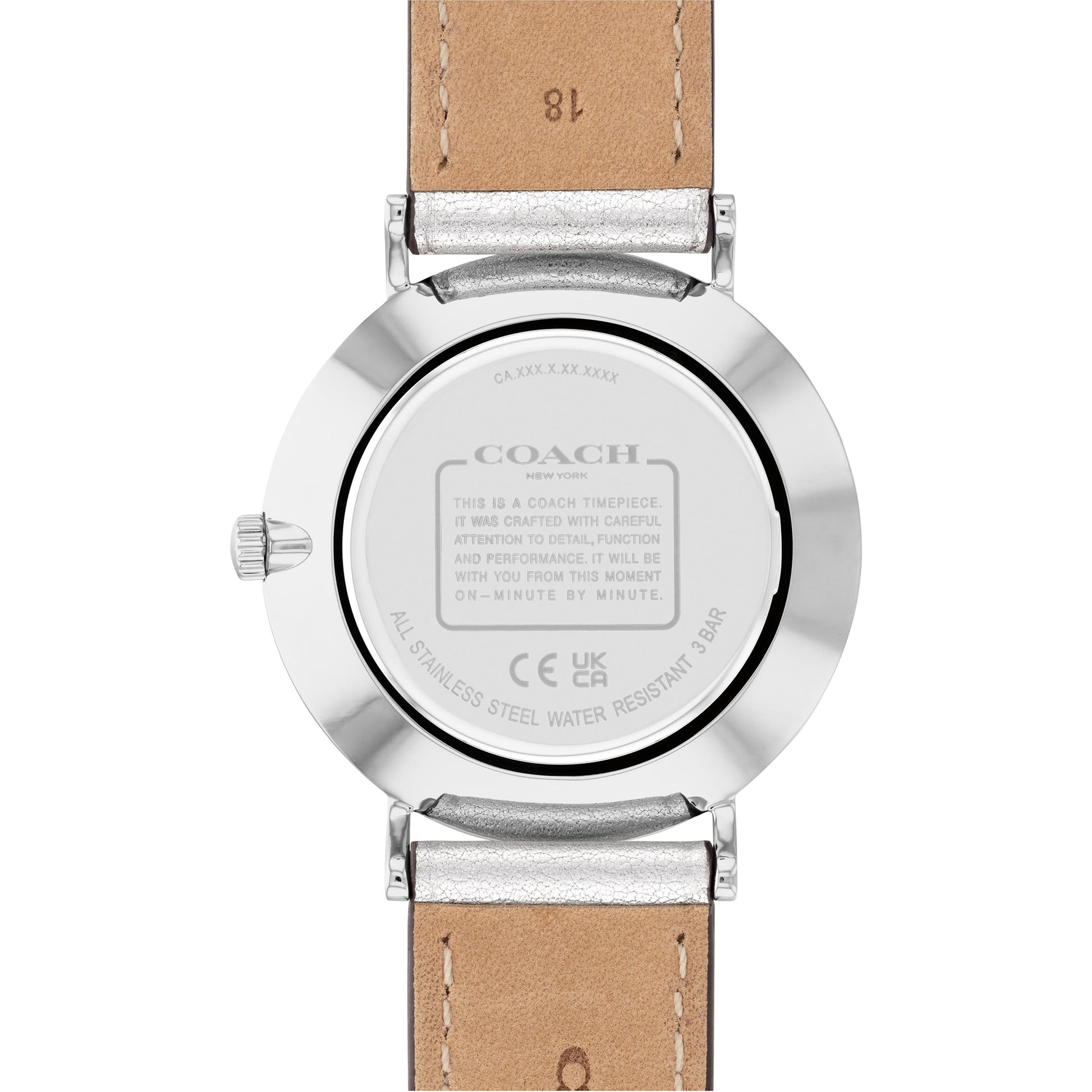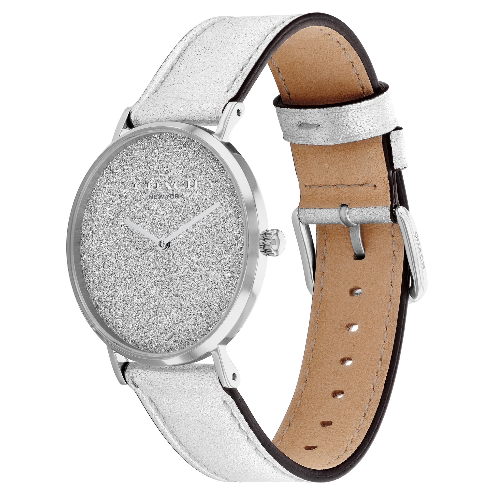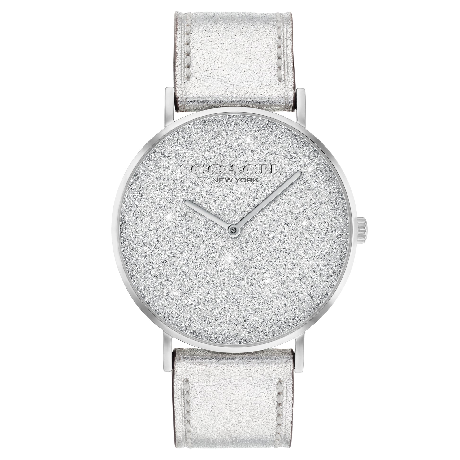 Named for a quiet street in New York City’s West Village, the Perry is a traditional round watch perfect for every day. Finished with a silver leather strap, the stainless steel design dazzles with a shimmery glitter dial.